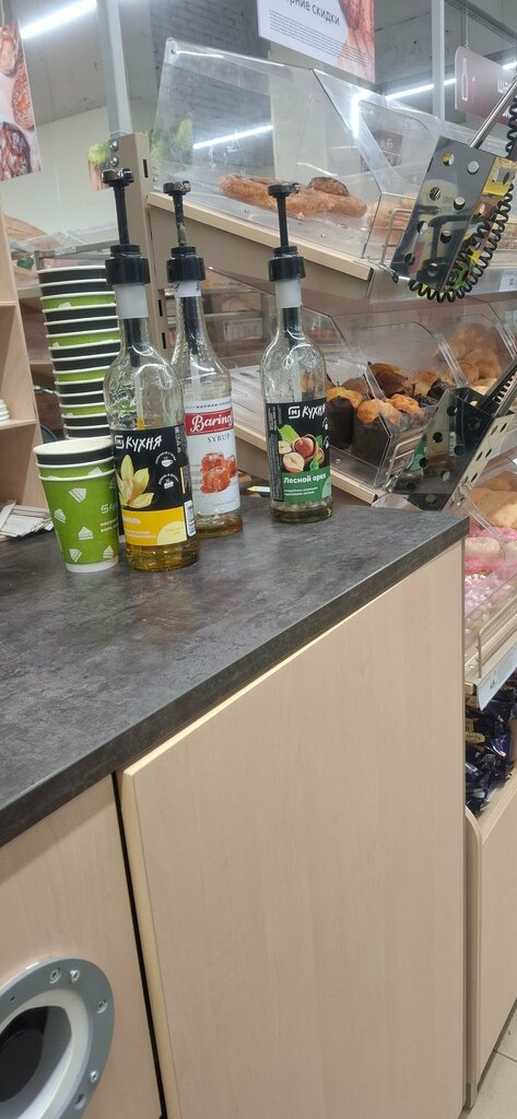 Очереди в выходные огромные,только 1 кассир,хотя-бы чай дешёвый,сиропов мало,и они не могут налить сироп.Чая почти нет,с сахаром тут вообще беда.Не особо рекомендую.Но есть один плюс,этот магазин находится на первом этаже дома,и у них выпечка (без мяса) неплохая