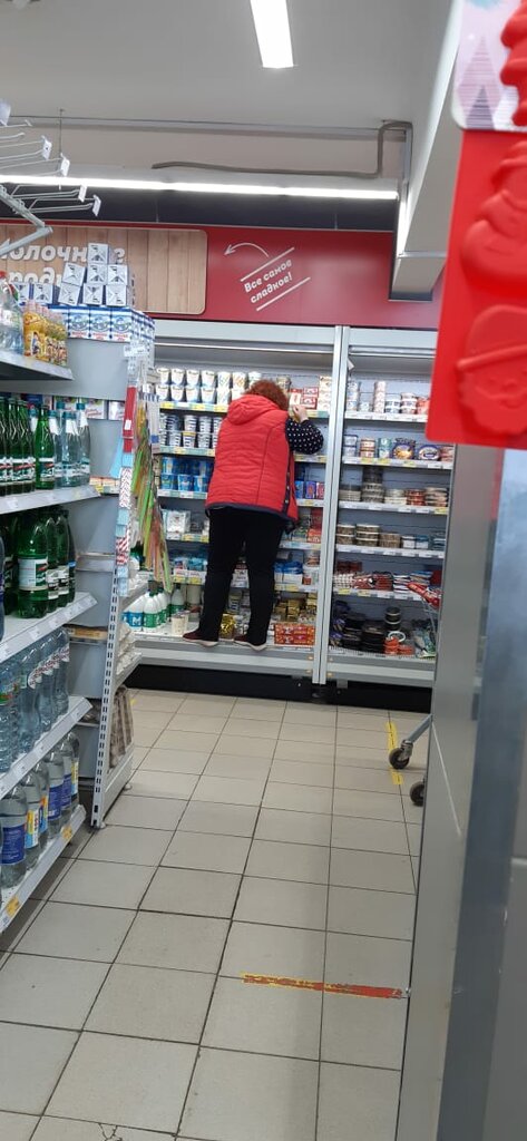 Магазин так себе. Выбор товаров неплохой для проезжающих мимо посетителей. Если нужно прикупить что-то срочно поесть. Однако проходы между прилавками неудобные. Нет тележек. В качестве достоинств следует отметить хорошую работу кассира, наличие терминала самообслуживания и небольшую парковку у магазина.