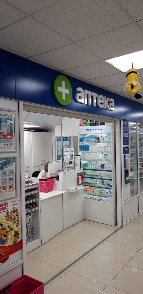 Аптека выглядит очень маленькой - лишь прилавок со стелажом два метра длиной. Отмечу какое-то очень странное расположение внутри магазина, то есть нужно зайти в магазин, пройти через кассу, чтобы дойти до аптеки, не связанной с ним