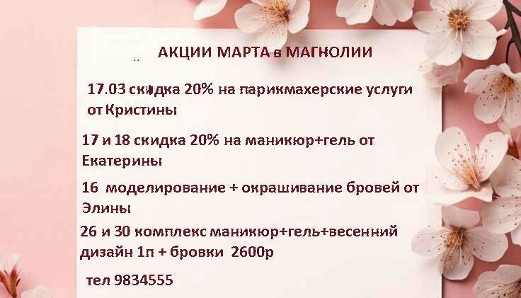 Встречаем весну вместе: Анонс акций марта .🌸 🎁17 марта "день клиента" скидка 20% у мастера парикмахера Кристины ( если потеряли мастера с...