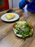 Заказали сырную шаурму. Думали, что она будет в сырном лаваше (как это обычно и бывает), но она оказалась с сыром внутри. Вкусно, прям очень даже. Еще брали половинку от шаурмы (название и цена неизвестны, так как цены на то, что лежит на выдачи отсутствуют, как и названия блюд), в составе оказался вкусный сыр, яйца. Тоже вкусно. Салат с кучей листьев был тоже неплох, но мяса в нём практически нет. Так, крошечные кусочки говядины (буквально несколько тонких полосочек). Персонал неприветлив, в туалете нет туалетной бумаги, бумажных полотенец. Обстановка в самом зале неплохая для столовой. Цены есть только в меню фастфуда. Не всё из меню фастфуда в наличии.