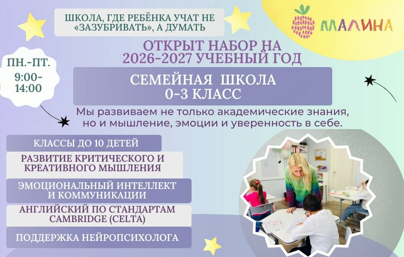 Наше знакомство с «Малиной» началось с 0 класса, куда я привела дочку, что бы просто подготовить ее к поступлению в 1 класс обычной школы. На момент начала занятий дочке было 5,5 лет и планировали ходить на подготовку к школе 2 года. Наши занятия вела потрясающий педагог Ксения Сергеевна, она за год научила мою дочку всему, что нужно знать ребенку для обучению в первом классе. Дочка прониклась такой любовью и уважением к нашей первой учительнице, что мы приняли решение пойти в начальную школу в «Малину»!!! Сейчас идет 6 месяц обучения, мы ни разу не пожалели о принятом решении!! Маленький класс (всего 6 деток), спокойная обстановка, потрясающие педагоги. Кроме основных предметов в программе есть и такие уроки, как эмоциональный интеллект, нейрогимнастика, триз, проектная деятельность. В хорошую погоду физкультура у детей проходит на улице, а рисование ведет потрясающая художница. В этой школе создаются все условия, для спокойного и гармоничного развития каждого ребенка. «Малина» наша любовь ♥️