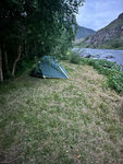 Размещались в палатке (собственная) место предоставили на деревянном подиуме за что благодарность, по стоимости места 1500р. Все удобства в виде душевой, общей летней кухни и туалетов комфортных есть! Все чистое и опрятное. Ночью шум реки напоминал мне автостраду, ну это все вкусовщина. Территория чистая с традиционными какашками парнокопытных. Администратор приветливый. Место приятное. Кайфанули и в путь! Йяхуу
