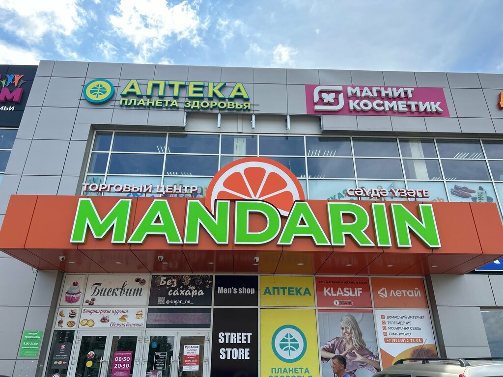 Мандарин - очень большой ТЦ в Менделеевске. Пятёрочка, Магнит косметик, Находка, Книги, Русалка, Летай, отличный магазин чая и кофе, большой "вьетнамский" магазин на втором этаже, детский магазин, аптека, и другие.