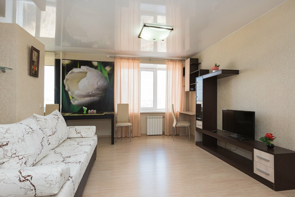 Никому не советую эту компанию, отношение к клиентам пофигистичное. Сначала были проблемы с заселением - позвонили в 12-30, что скоро будем, можно ли заселиться пораньше, ответ: нет, только с 14-00. Ладно, подъехали к 14-00, сообщают, что человек с ключами в пути. В итоге заселили только в 15-00, от женщины, которая заселяла не услышали ни извинений, ничего, плюсом оказалось, что нет белья и полотенец совсем, будут позже. В итоге полный комплект постельного и полотенец мы получили в 21-00 после нескольких звонков, по посуде тоже полный треш, 4 тарелки плоские и 4 суповые. Ни дуршлага, ни салатника, ни ковшика хоть какого-нибудь((( матрас продавленный напрочь, на лоджию даже смотреть не хотелось. Лампочек в люстрах мало, свет тусклый везде. В плафонах куча мёртвых мух(( За окном идёт стройка, шумно, а заявленного в объявлении кондиционера нет, а для нас это был важный пункт при выборе квартиры
