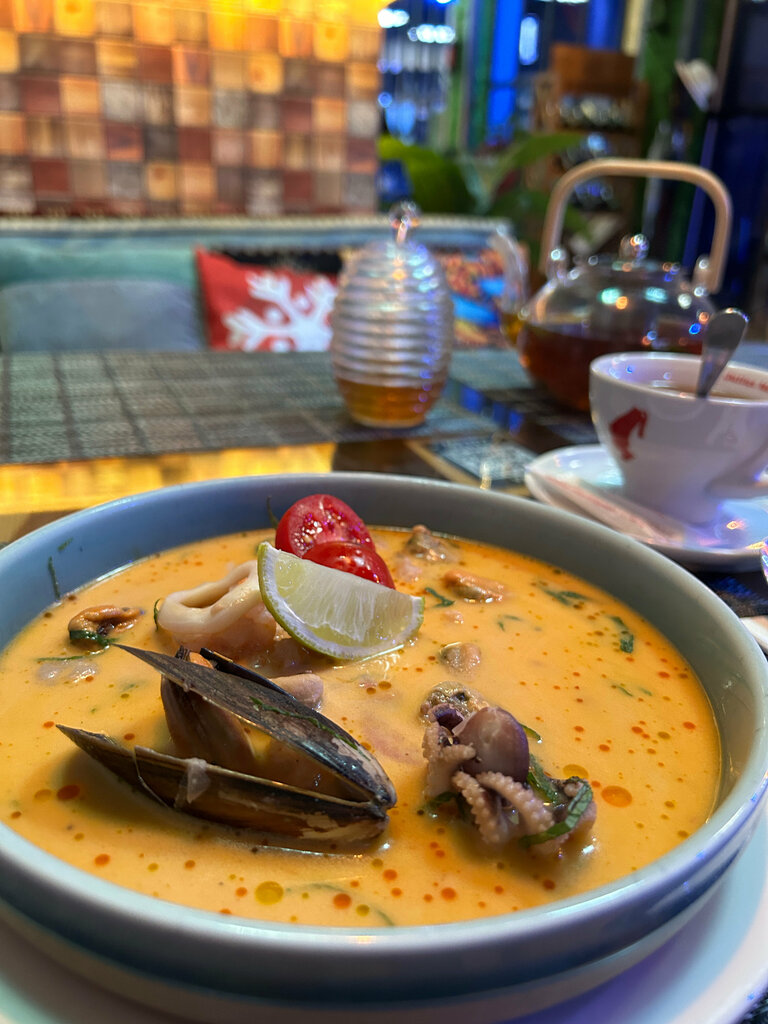 We had dinner and breakfast several times, very tasty!!! Ajakhuri (roast) is served in clay plates, the dish stays hot for a long time even outdoors! Excellent borscht! Salads, pancakes, zrazy! A very large menu! The portions are large, the staff is friendly, they speak Russian! Link to the menu https://marao-cafe.ge