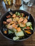 из сёмги и балтийского судака, подается со сметаной, креветками и долькой лимона.