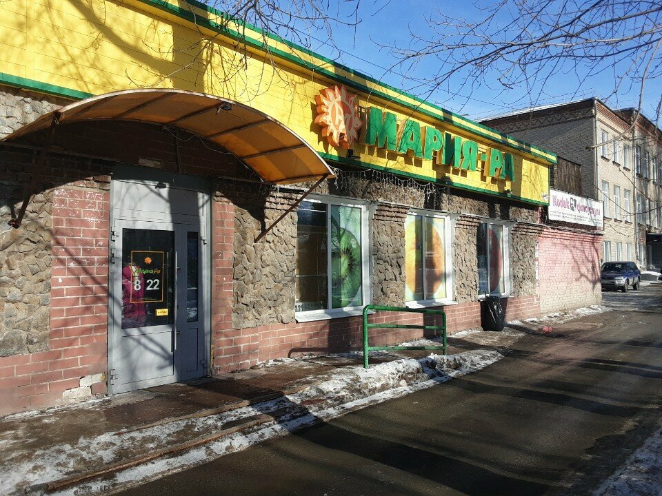 Магазин расположен возле трамвайной остановки. В центре городка строителей - Париже.. Магазин Мария Ра -барнаульский. Продается там качественная и недорогая алтайская продукция -мука, макароны, крупа... Раньше цены были такие же как и в Ярче. Сейчас стали немного выше. Зато много акций.