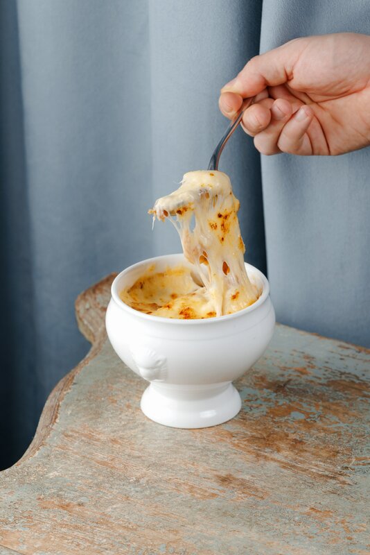 Французский луковый суп с беконом, запеченный под сырной гренкой