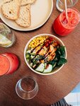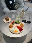 Очень приятное современное кафе со вкусными и полезными блюдами, стильным интерьером в актуальной бежево-шоколадной гамме, особенное внимание привлекают в интерьере геометричные колонны из шариков. В меню пробовала комлексный завтрак, завтрак 🍳 с картофельными вафлями, боул с лососем, чизкейк сникерс, арбузный фреш 🍉 всё очень вкусно. Арт на стенах заслуживает отдельного внимания 🤍