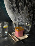 Кисло-острый бульон с лемонграссом, листьями лайма и галангалом, сливки и кокосовое молоко, креветки и кальмар, грибы шитаке, муэр, эринги и лук порей, рис басмати, лайм и водоросли чука.