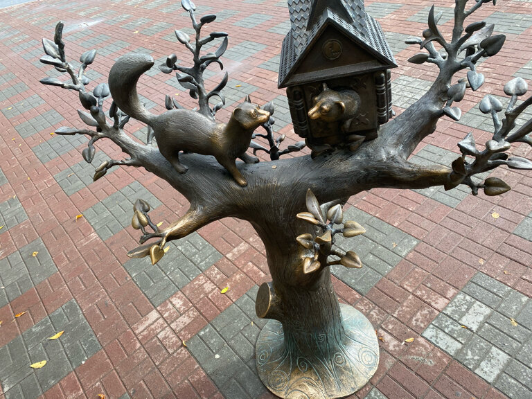 Уютная и стильная скульптурная композиция «Домик куницы» перед входом в один из самых старых и знаковых столичных парков символизирует собой и герб города, и приветствие гостям столицы. По традиции потертый носик зверька, видимо, свидетельствует о неиссякаемой вере посетителей парка в чудеса!