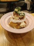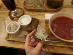 Атмосферно, что уж говорить... Борщ (шла именно за ним): обычный, честно. Просто обычный "ничеготаковошный", ничем непримечательный борщ. И совершенно несоленый. То есть такое ощущение, что просто забыли... Намазка на хлеб к нему была вкусная. Муж и сын взяли солянку. Не понравилась им совсем. Мяса нет, одни сосиски, какая-то жиденькая, без намёка на мясной бульон. Самое интересное, что муж тоже потянулся к солонке, со словами "вообще не солёная". Драники. В целом, неплохо, брали сеты. Но ооооочень жирные, просто плавают в масле, как будто повару кажется, что мало, что к ним подают жирные свиные шкварки. К сожалению, на фото не передать это обилие масла. Вот Десерт сыну понравился)