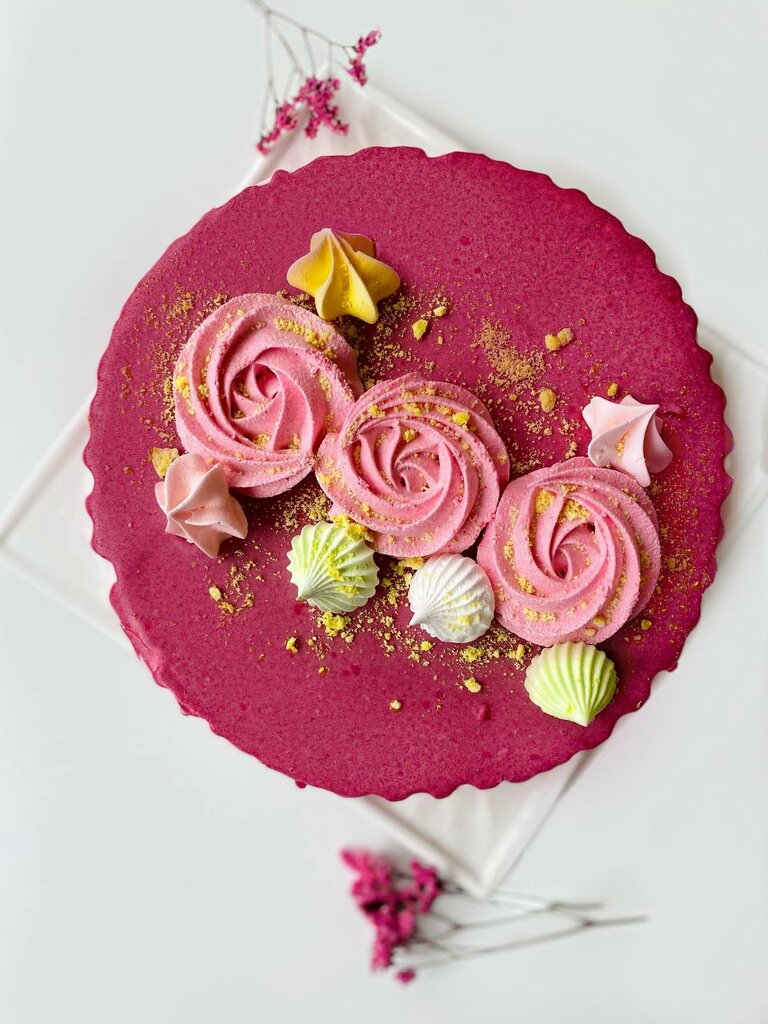 Ванильные бисквитные коржи, с прослойкой из хрустящего пралине и пикантной вишни в сочетании с нежным крем-чизом и всё это окутано нежнейшей, воздушной меренгой. Вес торта-900 г.