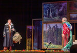 В этот вечер Большой зал КЦ "Меридиан" был полон. Театральная компания Маскарад давала спектакль "Лес" по пьесе Островского в постановке Романа Самгина с Заслуженной артисткой России Олесей Железняк и Народным артистом России Игорем Бочкиным в главных ролях. Прекрасный выбор для нашего, удаленного от центра, района: с одной стороны не какая-то стремная современная пьеса, а Островский, так что можно и детей привести, с другой стороны знаменитые актеры, так что есть на что и самим посмотреть. Многие знатоки считают "Лес" самой совершенной, но в то же время и самой сложной пьесой Островского. В ней одновременно разыгрываются пьесы разных жанров. Два провинциальных актера Несчастливцев (Игорь Бочкин) и Счастливцев (Сергей Габриэлян) похожи на героев водевиля. Линия влюбленной пожилой помещицы Гурмыжской (Олеся Железняк) в недоучку-гимназиста Буланова (Борис Яновский) настоящий фарс со стремительным превращением недалекого мальчишки в заносчивого и наглого хлыща, а чачуханнной помещицы без возраста во влюбленную кокетку. Жанр, в котором живет бедная девушка Аксюша (Глафира Глазунова), для которой если любить, так без оглядки, если не с любимым, то хоть в омут - это уже жанр высокой романтической драмы. Соответственно в пьесе есть роли для актеров разных возрастов и различных амплуа, так что для антрепризы это удачный выбор. Сценография постановки с одной стороны проста и лаконична, что характерно для антрепризы, но с другой стороны оригинальна и талантлива. Пьеса называется "Лес" и художник-сценограф Максим Обрезков остроумно украсил сцену репродукциями картин Русских художников с изображениями леса. А уж кому дали разгуляться, так это художнику по костюмам Ирэне Белоусовой. По мере того как чувства Гурмыжской к Буланову расцветали, ее платья становились все более яркими и вычурными. Красное свадебное платье с голубями это настоящая победа художника над безвкусицей, пошлостью и китчем. Публика приняла спектакль с восторгом: много смеялись и аплодировали, на поклонах завалили актеров цветами и подарками. Так что наш очередной выход в театр оказался очень удачным