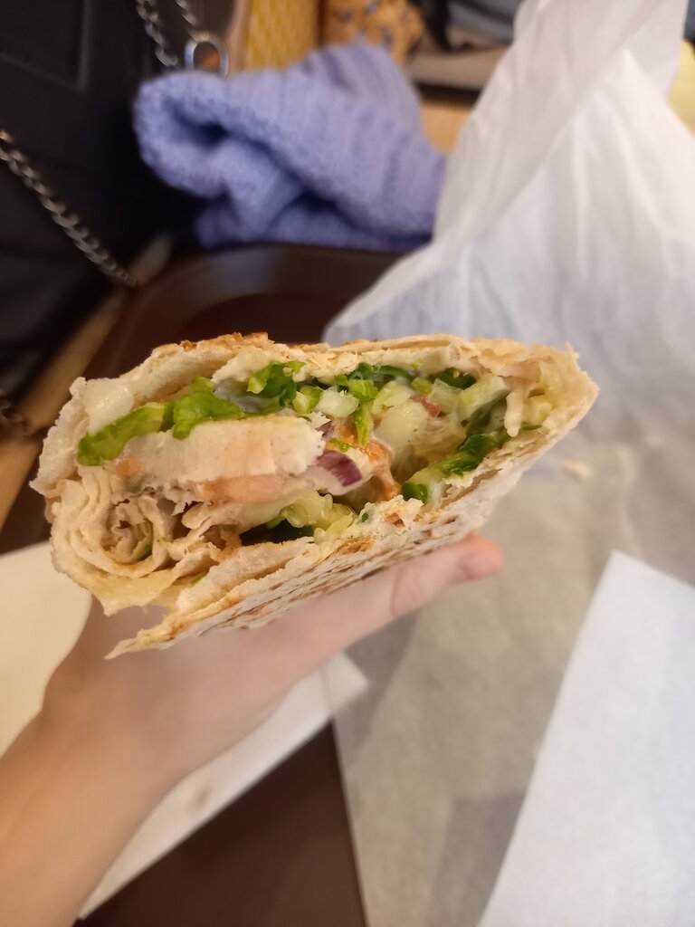 Заказал на тарелке. Принесли в пластиковом контейнере. Без лука, без солёных огурцов. Мясо хорошего качества, но оно не с вертела, как положено, а скорее варёное. Соус явно какой-то свой, к шаверме отношения не имеющий. Остренького не положили и не предложили потому что докупить нельзя. Вернусь ли сюда? - НЕТ. Посоветую? - НЕТ. Из плюсов - отсутствие очереди. Потому что желающих не особо много. Овощи соусом не политы. Картошки фри в шаверме нет.