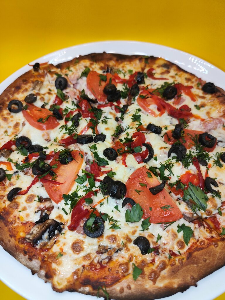 Салями, бекон, болгарский перец, грибы, помидор, маслины
