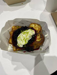 Обжаренный во фритюре картофель подается с соусом дзадзики, в основе которого сметана, майонез, свежий огурец и чеснок