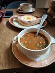 Заказали чебуреки классические и мясо вообще не смогли съесть, только тесто. Потом рыбный суп, который был почм кислый, надеюсь, что не испорченный. Брали также куриный суп и он был пересолен. Более или менее был норм хачапури мини, хотя там было много творога и жаренный картофель, где не было соли. Место так себе, не очень оценили и не понятно почему такой высокий рейтинг