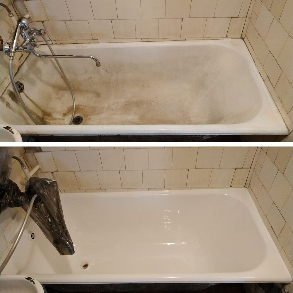 На фото — наглядный пример “до/после До: желтизна, ржавчина у слива, шероховатость, следы времени. После: ровная гладкая поверхность и акку...