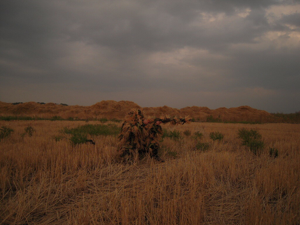 халат "Призрак". Одевается поверх основной одежды. Представляет собой халат по крою с рукавами и капюшоном. Основа халата трикотажная сетка, на которую нашиты маскирующие элементы из натурального лыка, которые максимально размывают силуэт человека,