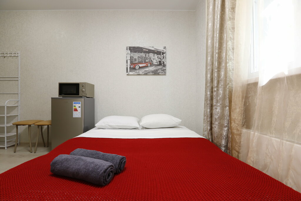 Квартира небольшая, все чисто (белье, техника, полы). В комнате есть минимально необходимое - шкаф с плечиками; посуда чайник микроволновка; гладил доска с утюгом; фен. Отмечу - сантехника прям новенькая. Расположение нашла быстро, видел также помогло. если вы будете впервые в этом районе сделайте скрин маршрута заранее (могут в районе «глушители» работать и сбивать навигацию).