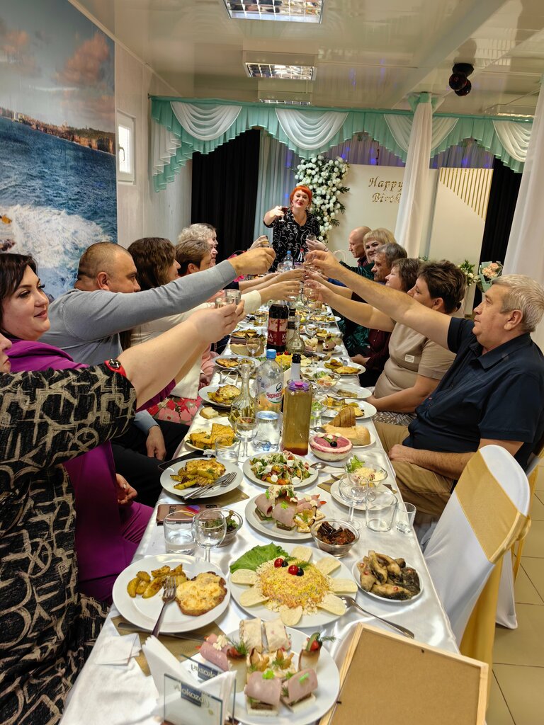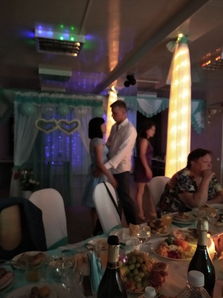 Недавно сын играл здесь свадьбу. Зал украсили в бело-голубых тонах .Музыка на наш вкус. Во время танцев выключали свет, а зал освещался гирляндами. Что создавало приятную атмосферу. Стол накрыли красиво. Девушка-официантка не только нас обслуживала, но и за детками( малышей было трое)приглядывала. Но особенно хочется отметить еду. Блюда были не только красивыми, но и по-домашнему вкусными. Хочу сказать директору кафе Наталье Юрьевне большое спасибо. Нам понравилось.