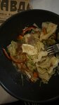Салат на основе жаренных во фритюре цукини и баклажанов, свежих огурцов, болгарского перца, томатов, сельдерея, лука, моркови по-корейски с жаренной говяжьей вырезкой. Заправляется соевым соусом и маслом.