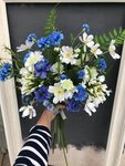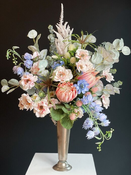 Букет из искусственных цветов с анемонами, эвкалиптом. В состав букета добавлены премиум ягодки голубики. Букет выполнен по кругу, со всех сторон. Ваза не входит в стоимость.