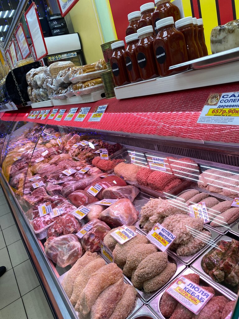 Мясо всегда свежее ,красивый отдел мясной ,сало очень вкусное с мясными прожилками -с чёрным перцем с чесночком на Бородинском хлебе -на ураааа улетает,из кулинарии -индюшачьи горлышки очень вкусные с овощами потушить ,долма нравится и ещё купаты вкусные -на скородочке с корочкой поджаришь .Рыбный ассортимент нравится -рыба Снежная или Ледяная ,рыба Хек вкусная -пожаришь -вкусно .Персонал отзывчивый ,доброжелательный 🤗Рекомендую :мясо взяла- рядом овощи 🌶 фрукты 🍇