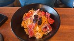 обжаренные креветки, маринованные томаты черри и запеченный перец на подушке из микса салата, заправленного в соусе Том-ям и пряным манго-чили