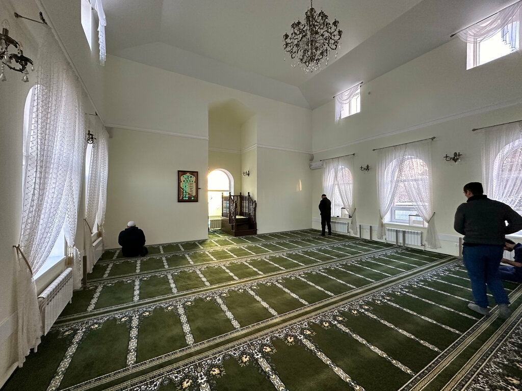 Изнутри очень уютная, красивая мечеть, прямо особенно хорошо здесь. Хотя любая мечеть прекрасна - ведь это дом Аллаһа. На окнах очень красивые занавески, на подоконниках много зелени, цветов. Есть тахаратная и для мужчин, и для женщин. Везде чистота ма шаа Аллаһ. В Рамадан проходили ифтары, но мы в мечети бывали только днём. Территория мечети украшена цветами, есть достаточное количество парковочных мест, в том числе и для людей с особенностями.