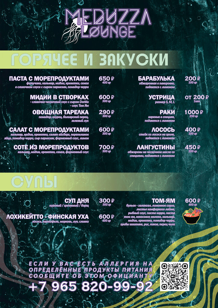Здравствуйте, что хочу и могу сказать про заведение MEDUZZA LOUNGE. Заведение просто на высшем уровне, из всех что я знаю на побережье Крыма. А в новофедоровке тем более такого вы нигде не найдете. Устрицы Очень вкусные, свежие всегда, и самое что не менее главное они очень превосходят ожидания. Морепродукты всегда свежие,сам регулярно наблюдаю за ежедневным привозом продукции для меню, очень огромный ассортимент выбора меню,также помимо основных блюд очень великий выбор напитков, свежие приятные на вкус, а особенно смузи вас не оставит в беде и спасёт от жажды. Персонал даного заведения всегда приветлив, опрятно выглядит, соблюдают всё санитарно-технические нормы при приготовлении блюд, что очень важно в приготовлении даного вида кухни и блюд. Ребята очень отзывчивые и помогут при малейшей просьбе, т сделают всё что в их возможностях. Кстати забыл что у них самые крутые официанты, они особены своею пунктуальностью и добротой, свою работу выполняют на ура, поэтому заведение находится всегда в чистоте и в велеколетном порядке. Атмосфера заведения MEDUZZA LOUNGE просто невероятна в любое время суток, но прийдя туда вечером вы увидите всю сущность заведения, прекрастно поужынаете с видом на море, и никто не нарушит ваш покой, также при желании там можно прекрасно провести время за просмотром кинофильма или вашей любимой программы, на большом проекторе, что также является одной из особенностей заведения. Время ожидания минимальное, всё зависит от выбора блюда. Еда Потрясающе вкусная свежая, сытная особенно хочу сказать что повара невероятно вкустно готовят СУП ТОМ ЯМ.. Вывод хочу сделать следующий, если вы любитель море продуктов, и действительно хотите вкусно а главное спокойно поесть, без лишнего шума, так ещё и с прекрасным видом на море 🌊 , то советую вам немедлить а собираться и при первой же возможности, прийти в самое лучшее заведение на побережьи Крыма MEDUZZA LOUNGE. Ребята Вы лучшие спасибо вам большое за прекрасный вечер ❤👑