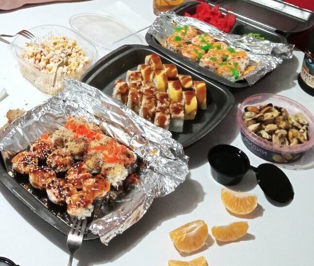 Variety of food:sushi and rolls, pizza, fixed meal, сhinese food, home cooking, healthy eating, burgers