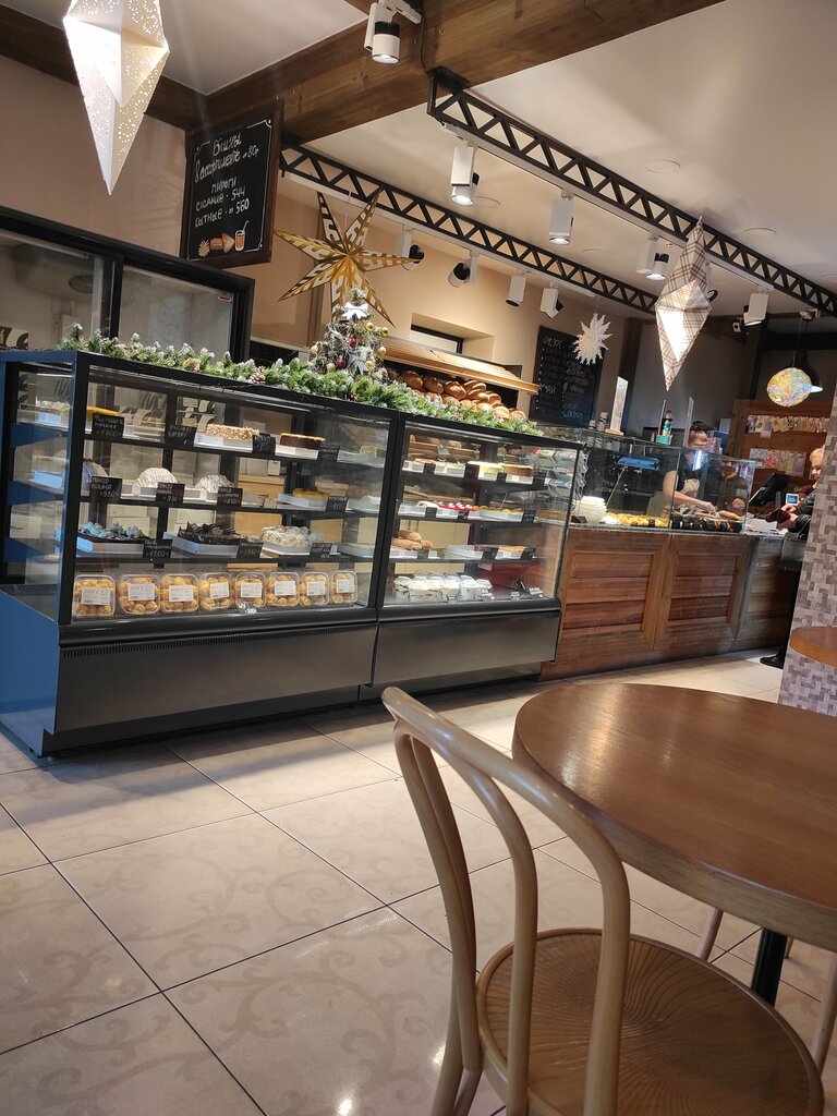 Уютно кафе, вкусные пирожные, присутствует довольно обширный ассортимент. Особенно нравятся панорамные окна с видом на украшенную улицу. Доброжелательный персонал, разные напитки