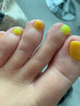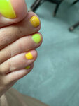 Педикюр с гигиеной и покрытием: форма ногтей не выведена, кутикулы залиты лаком. Когда записывалась, просила записать к самому лучшему мастеру. Работу других мастеров боюсь тогда представить