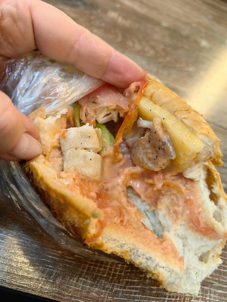 Взяла сэндвич с курицей за 129 рублей, думала будет посытнее пирожка... В принципе курицей пахнет. И взяла салат, обсчитали на 20 рублей 😏. В прошлый раз тоже что-то не понравилось, уже не помню что именно. Больше заходить не буду.