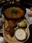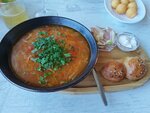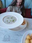 Зашли пообедать. Заказали борщ с пампушками, шурпу и грибной крем-суп, а также хлебную корзинку, сырные шарики, лимонад тропический, вино. Грибной подали в очень красивой тарелке с сухариками. Хлебная корзина состоит из маленьких булочек (теплых). Шурпа была подана также в красивой посуде в комплекте с маринованным луком. Борщ подавался с пампушками, сметаной, салом, чесночком и маленьким острым перчиком. Все первые блюда очень вкусные. Лимонад не стоит заявленной цены, 1000 за литр, пить приятно, холодный, но не более. Лимонад сделан из выжатых апельсинов, Лимонов и лайма с добавлением минералки. Вино вкусное. Рекомендую