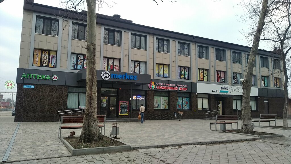 В торговом центре располржены РНКБ, аптека, кафе, магазин игрушек и одежды, а на третьем этаже офисы, в которых работают юристы, мастера маникюра и педикюра. В общем в одном здании можно решить сразу все вопросы. Одежда продается хорошего качества и по доступным ценам.