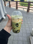 Напиток на основе коровьего молока с добавлением матчи и карамелизированной тапиоки с крем-чизом