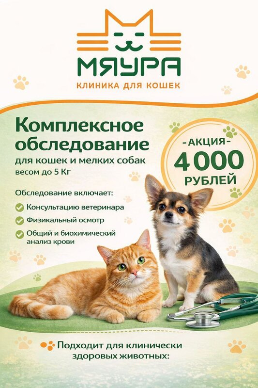 Комплексное диагностическое обследование для кошек и мелких собак массой до 5 кг Стоимость: 4000 рублей Предлагаемое обследование направле...