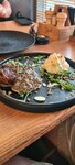 Антрекот с тушеной капустой и угольным картофелем