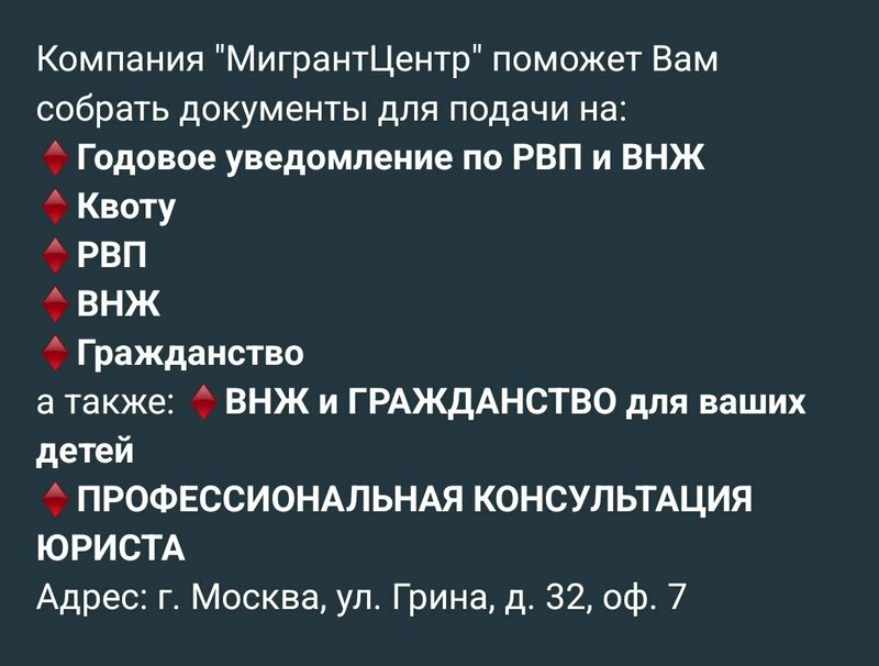 Акция❗Скидка 10% до 28.02.2026 года на пакет документов для подачи на: 🔸РВП 🔸РВП 🔸ВНЖ 🔸Гражданство 🔸Годовое уведомление