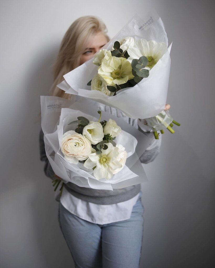 В составе букета: - розы - пионы ( в сезон) - эустома - стифа - упаковка Цветочный состав и визуальный вид согласовываем с Вами по фото и видео.