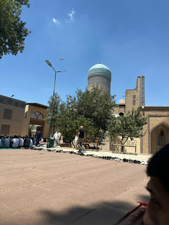 Near the mosque. Big, huge, you might say. Everyone is gathering here. He comes from far villages and even from the city. Rural mostly everyone goes here. To perform Friday prayer and not only.
