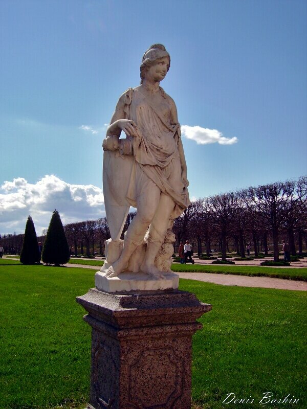 Верхний сад Петергофа раскинулся перед южным фасадом Большого дворца на территории в 15 гектаров. Планировка сада была выполнена по наброскам Петра I в строгом соответствии с законами симметрии, как это и было принято в регулярных садах того времени. Он имеет торжественно-парадный характер. В 1926 году началась реставрация партера сада по чертежам XVIII века. На местах, где ранее стояла садовая свинцовая скульптура, установили мраморную статую Минервы (богини мудрости) и Меркурия (бога торговли)...не проходите мимо...