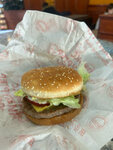 Из плюсов: Быстрое обслуживание Хороший персонал Из минусов: Брали только бургеры. Двойной чизбургер и Люкс Чикен. Двойной чизбургер 3/5 сухая булка и мало соуса, мясо очень вкусное. Люкс Чикен 1/5 маленькая котлета, очень много салата, большой слайс невкусного помидора, недостаточно соуса из-за салата его было незаметно, посредственная булочка похожая на батон. Интерьер оставляет желать лучшего, все пошарпанное Вход в туалет отдельный квест. Потребуется код из чека как в Бургер Кинге. Код на чеке плохо печатается, как и весь чек. Места в туалете мало, воняет. По итогу место подходит, чтобы перекусить и забыть. Возвращаться не хочется, тем более ценовая политика не соответствует качеству. на фото Чикен Люкс за 235 р. Простите, но это перебор)