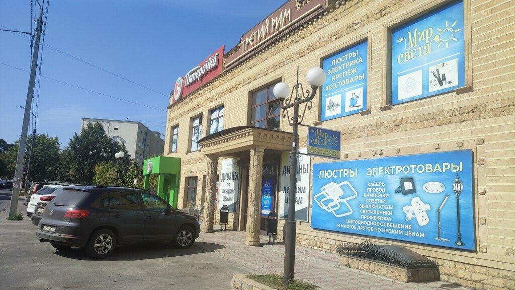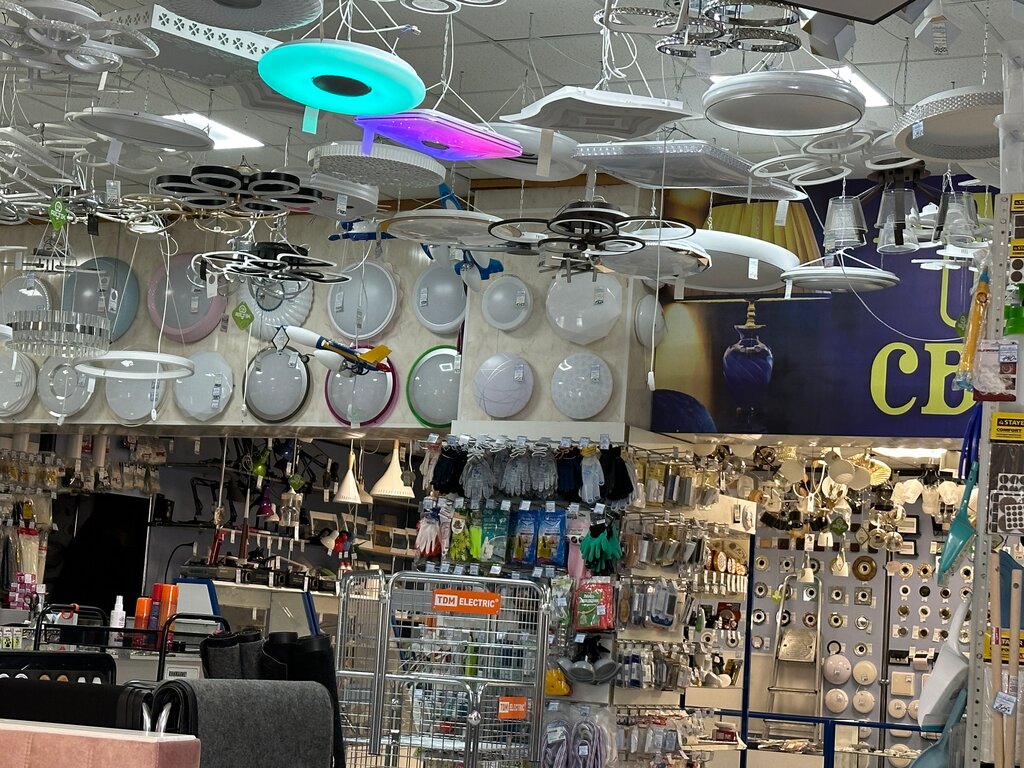 Огромный выбор люстр, электрики. Так же есть хоз. товары.
