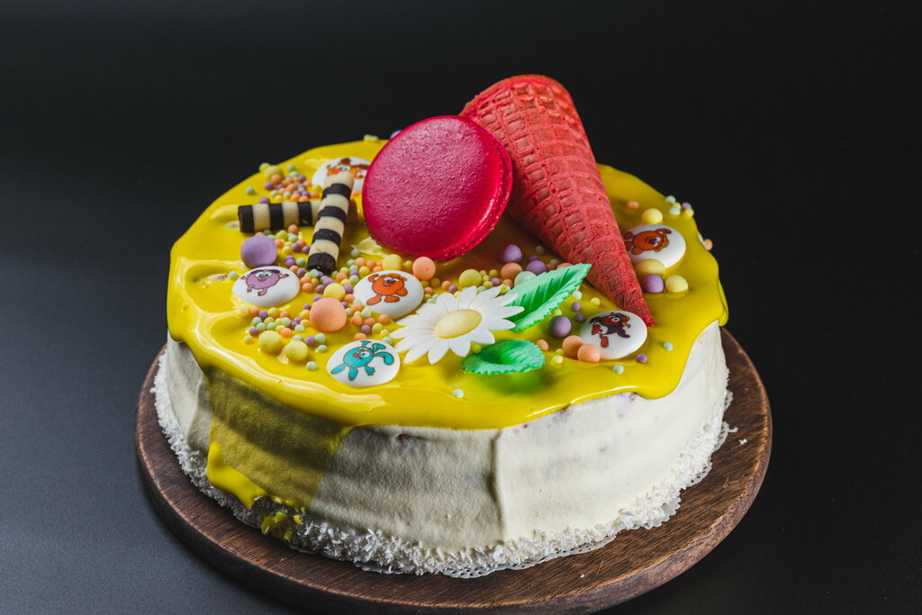 Три вида бисквита – шоколадный, ореховый, маковый, пропитанные сиропом и кремом крем-брюле, залиты белым шоколадом с арахисовыми лепестками.