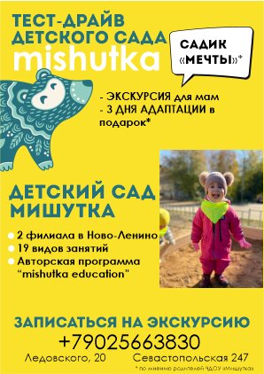 Прекрасный детский сад, пришли после муниципального, отношение совершенно другое, работают люди которым действительно нравиться своя работа, к детям относятся как к своим, первое время с ребенком сидели рядом в сон.час держали за ручку, если надо докормят с ложки🙂ребенок дома перестал кушать говорит в садике вкуснее, весь отпуск спрашивала когда в садик,говорит скучает по воспитателям и нянечки (Отдельная любовь). Ниразу не пожалели,что ушли с муниципального в Мишутку.С детьми каждый день проводят занятия на разные темы, лепки, рисование, подделки.